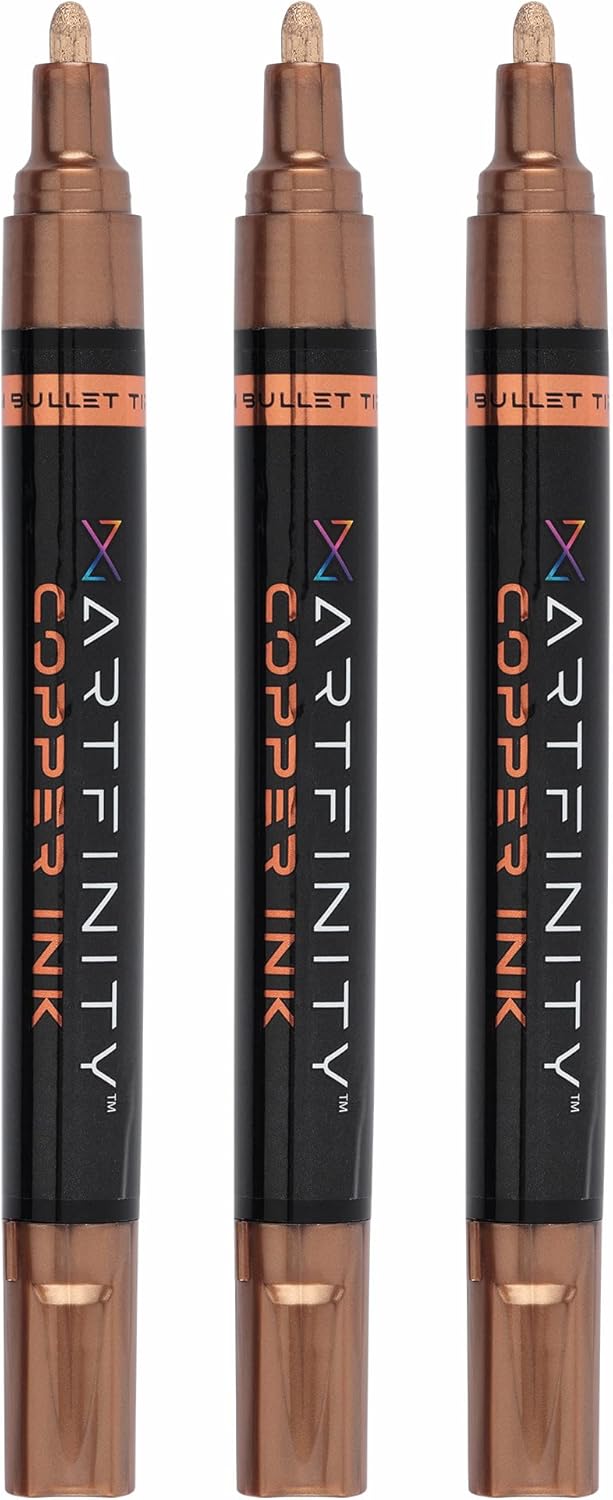 Make an impact with Artfinity Rich Metallic Inks! Artfinity Rich Metallic Markers and Inks are Designed to add that wow factor to your art. The ink dries to a permanent Metallic satin finish on non-porous Surfaces. These rich gold, copper, and silver Metallics are Available in a bullet tip marker, chisel tip marker, or ink bottle. With the chisel tip, you can achieve a range of line widths from 1.5mm to 8.5mm. The 3mm bullet tip marker is Perfect For outlining and drawing consistent lines. For more detailed and precise brushwork or when additional coverage is needed, the 30ml bottle does the job. The ink even works well in an airbrush! The solvent-based permanent ink adheres to non-absorbent Surfaces like glass, plastic, and ceramic. For best results, prime porous Surfaces like paper, Canvas, and Wood with a PVA primer.