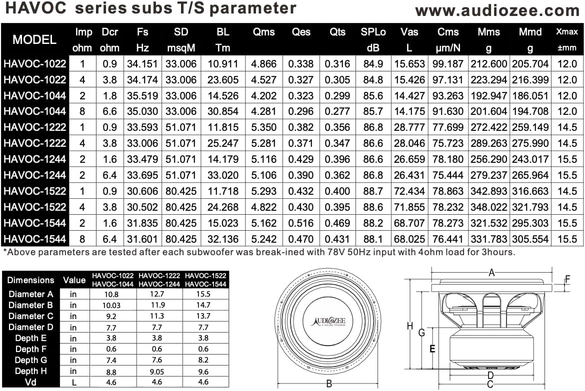 | Model Name | AUDIOZEE Havoc 12" Dual 2 Ohm Car Subwoofer – 1600W RMS / 3200W Max |
