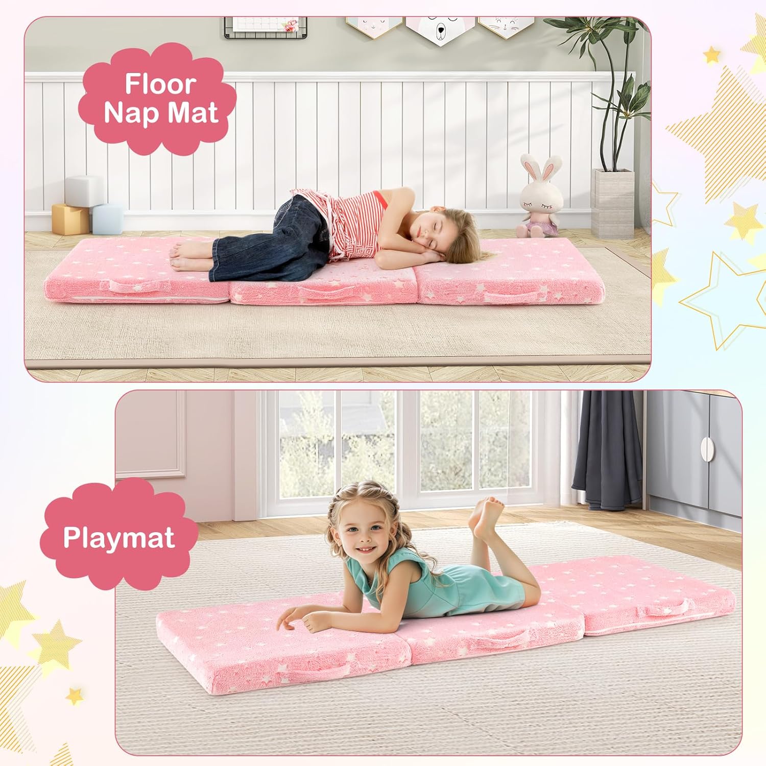 Bring comfort and convenience to your child with our foldable floor mattress! This tri-folding toddler nap mat not only provides a cozy sleeping and playing spot but also illuminates with a fun glow-in-the-dark feature that children adore. Watch your little one marvel as their sleeping space gently lights up, creating a soothing nighttime atmosphere. Filled with high-resilience sponge, this floor mattress offers substantial support and comfort. The removable & machine-washable flannel cover is not only soft to the touch but also easy to clean. Furthermore, its portability is enhanced with 3 integrated carrying handles and the included storage bag, allowing effortless transportation wherever needed.