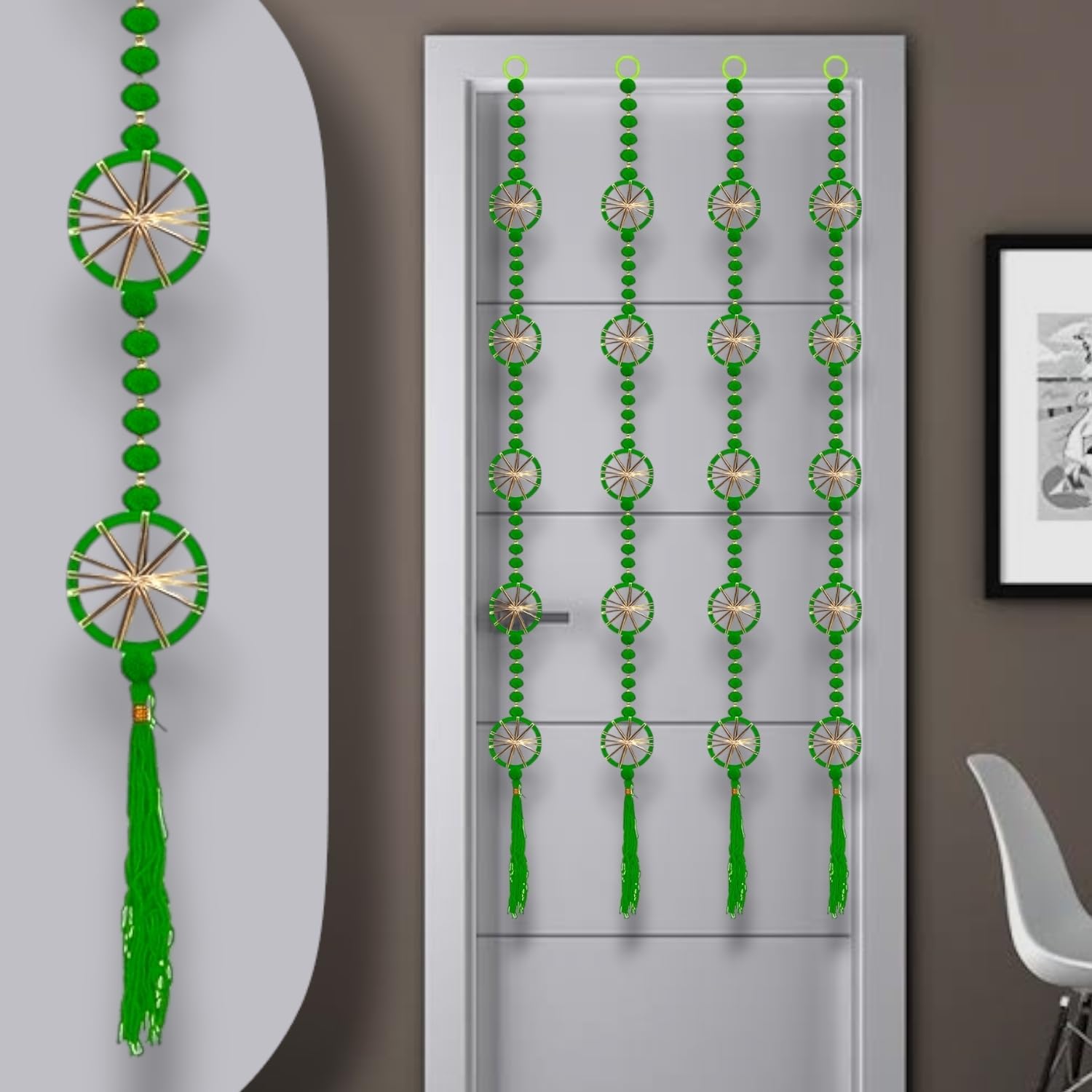 Transform your home into a space filled with cultural richness and charm with Rajasthan Kraft’s Handmade Decorative Lotus Toran. This beautifully crafted toran combines vibrant lotus motifs, intricate beads, a detailed Jali Ganesh design, and colorful pom-poms. Measuring 40*9 inches, it is perfect for adding elegance to doors, windows, or entryways, making it an ideal choice for home decoration, festival decorations, and housewarmings. The toran is designed with attention to detail, showcasing the artistry of Rajasthan and creating an inviting, spiritual atmosphere. Handmade by skilled artisans, each piece embodies traditional craftsmanship with a touch of modern charm. The lotus design symbolizes purity and grace, while the Jali Ganesh is revered for bringing good fortune and removing obstacles. The pom-poms add a playful, festive touch, making this toran suitable for a variety of occasions, including Diwali, weddings, or any celebration that calls for traditional décor. The flower bell accent adds an additional layer of charm with its gentle, soothing sound, enhancing the spiritual aura of your home. Perfect for adorning entrances, this toran creates an auspicious and welcoming atmosphere for guests. Its versatility allows it to be used in different spaces, whether in the living room, kitchen, or hallway. This toran is also an excellent gift option for housewarmings or festive occasions, offering a cultural touch that will be cherished by the receiver. Crafted with high-quality beads, fabric, and pom-poms, this toran is durable and designed to last. The combination of elements, including the lotus, Jali Ganesh, and pom-poms, creates a beautiful and harmonious decorative piece that is sure to brighten any home. Celebrate the traditions of Rajasthan and infuse your space with positivity and festive cheer with this stunning Handmade Decorative Lotus Toran.