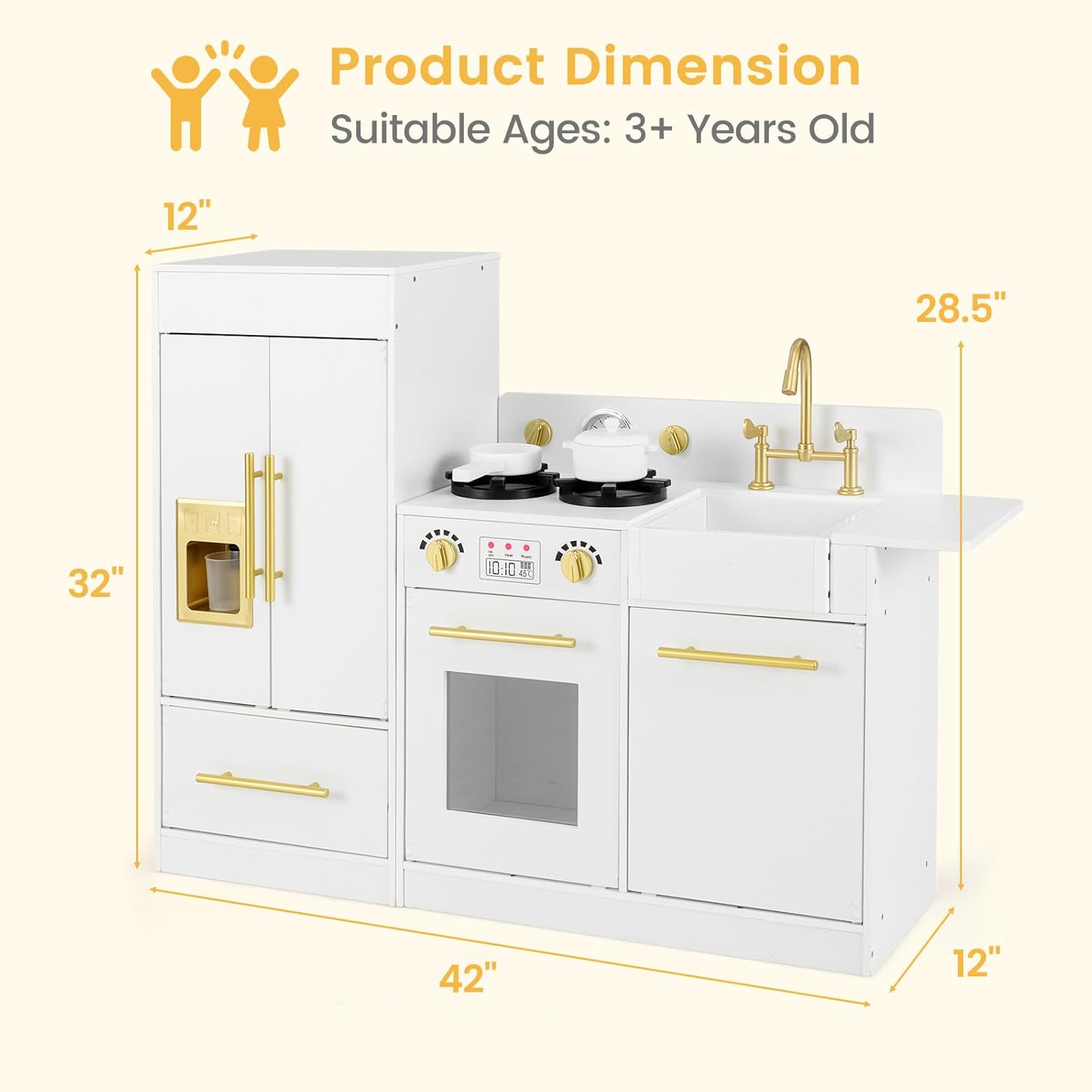 Why do you choose INFANS Kids Play Kitchen? Introducing our remarkable wooden pretend kitchen, a world of endless possibilities awaits! Crafted with premium quality medium-density fiberboard, this kitchen cooking toy comes complete with accessories, including a refrigerator and stove. Through cooking games, kids can learn the names of different ingredients and get familiar with cooking procedures. What's more, role-playing games can also exercise children's hands-on skills, promote hand-eye coordination development, and provide children with a good opportunity to practice language and social skills. Ignite child's imagination and strengthen the parent-child bond through our captivating toddler kitchen. The toddler upgraded wooden play kitchen features a spacious design with open shelves and closed cabinets to provide plenty of storage space for toys. This is an Ideal gift for kids birthday and Christmas.Features: Comes as 2 separate pieces - the refrigerator and the stove & sink modular Includes accessories such as spoon, fork, stew pot, frying pan Provides plenty of space for storing pretend food, kitchen utensils and more The refrigerator includes double doors and a functioning ice dispenser Raised stove burners plus turning knobs and levers provide realistic details The sleek white finish and gold hardware fit in any room Promotes cooperation and communication Recommended for kids 3 years old and up Ideal present for birthdays and special occasionsSpecification: Colorful: White Material: MDF Net Weight: 39 Lbs Dimension of Refrigerator:14” x 12” x 32” (L x W x H) Dimension of Stove: 28” x 12” x 28.5”(L x W x H) Overall Dimension: 42” x 14” x 32” (L x W x H) Suitable Age: 3+ Years Package includes: 1 x Kids Play Kitchen 1 X Multiple Kitchen Accessories 1 x Instruction