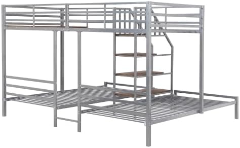 Metal Triple Bed with Storage Shelves and Staircase, Twin over Twin Metal Bunk Bed Frame for Kids & Teens This metal bunk bed features three beds in one, truly a space-saver. With a twin size bed on top and two twin size beds underneath, this bed is ideal for accommodating guests and sleepovers, and also perfect for family with multiple members. The staircase between beds is available for storage and the down bed is 10.4" off the floor, so there's spacious space under the down beds, you can use it to store your stuff. The top bed is equipped with full-length guardrail, keeping user's safe from falling. Coming with great quality and multiple function, this bed will be the best addition to your bedroom. Weight & Dimensions: Product Dimension: 101.2''L x 77.4''W x 57.8''H Product Weight: 180 LBS Detail Product Dimension: Please refer to the size image Number of Package: 2 Package 1: 46.1 * 24.2 * 7.51 in. 100.62 lbs. Package 2: 87.4 * 14.76 * 4.72 in. 77.76 lbs. Weight Capacity (Upper/Down): 300 LBS/300 LBS Number of Slats: 22pcs Recommended Mattress Thickness (Upper/Down): 6''/8-10'' Specifications: Product Type: Metal Triple Bed Size: Twin over Twin/Twin Color: Black/Silver Product Material: Metal+MDF Box Spring Required: No Mattress Included: No Assembly Required: Yes Country of Origin: China Notes: -Manual measurement has been used, there may be some reasonable error. -All the pictures are taken by actual samples, slight chromatic aberration may occur due to lighting or display.