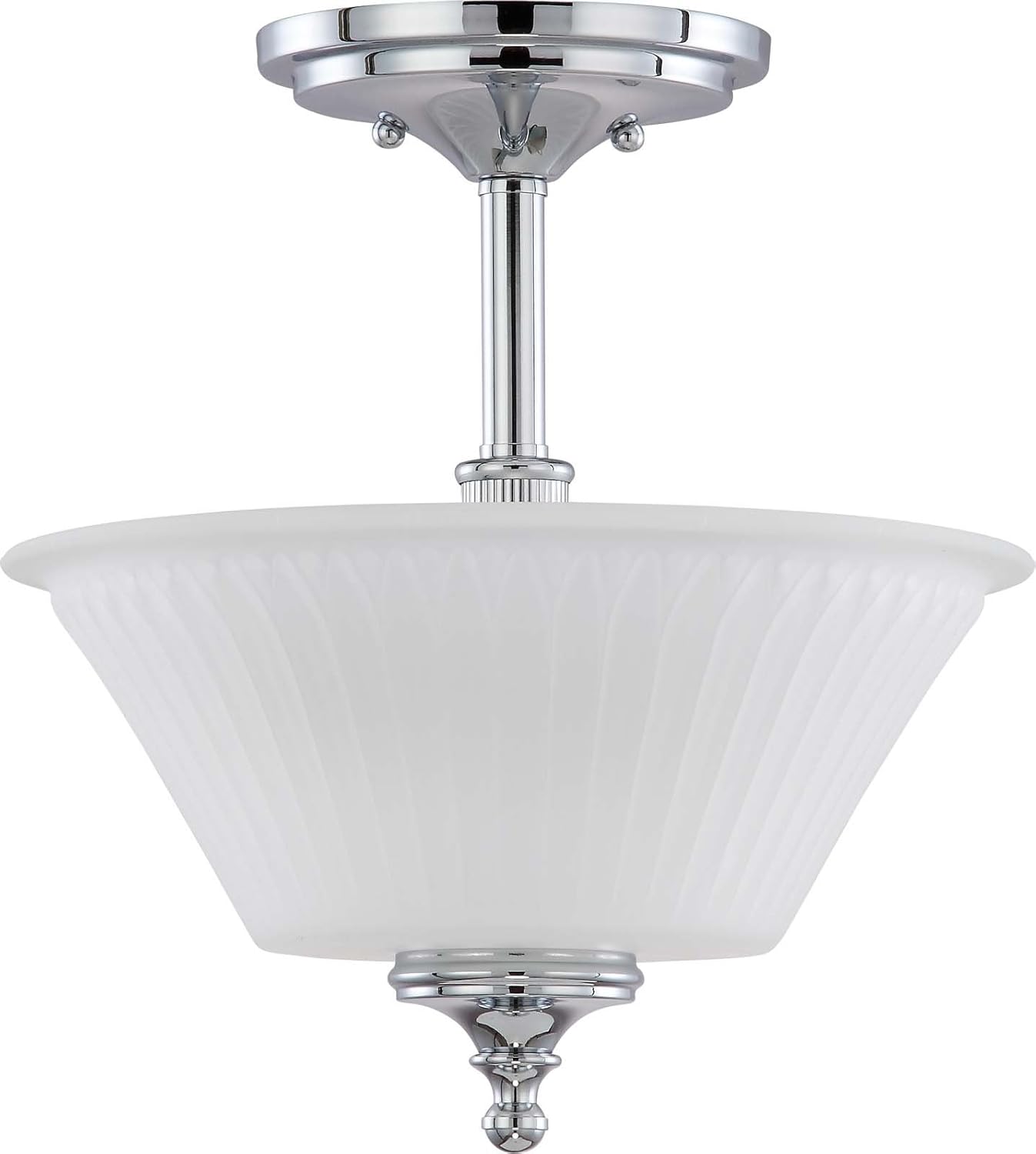 Product Description Nuvo Lighting 60/4263 Transitional Three Light Vanity from Teller collection in Chrome finish, Height: 9. 00 inches Width: 21. 00 inches Style: Transitional Light Type: Vanity & Wall Safety Rating: cULus and Safety Listing: Damp Number of Lights: 3, Bulb(s) Included: No From the Manufacturer This vanity fixture design is timeless and elegant. It is finished in polished chrome making it easy to coordinate with today's bathroom fixtures. The beautifully embossed frosted etched glass shades makes for even distribution of light.