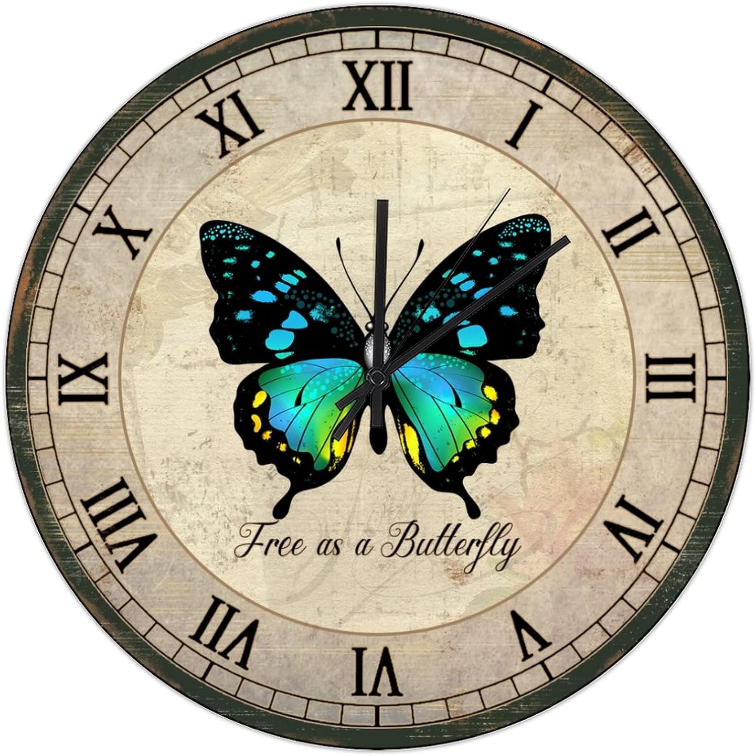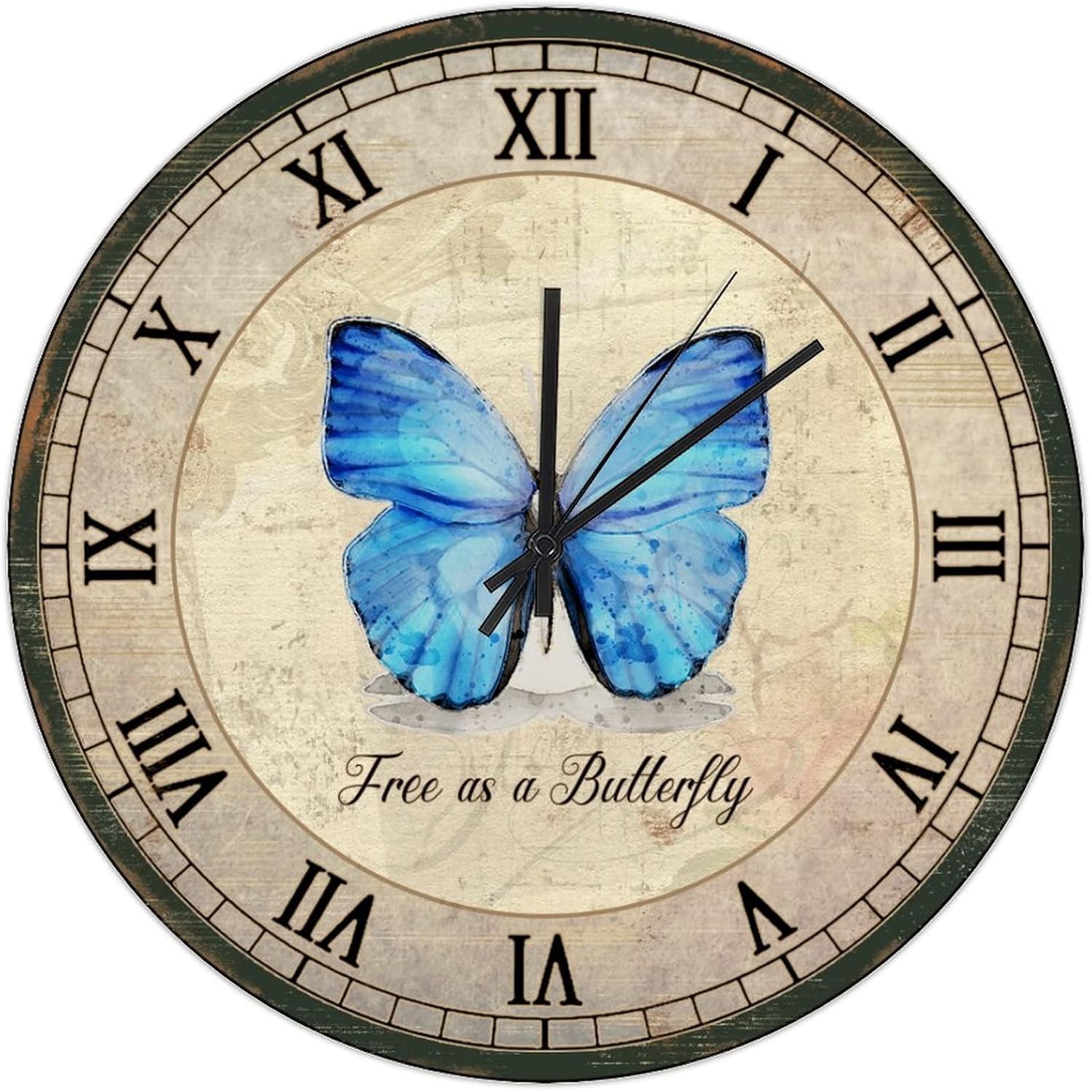 UFunhome 12-Inch Wall Clocks Free As A Butterfly Butterfly Light Blue Round Battery Operated Retro Wooden Clocks Silent Non Ticking Roman Numeral Wall Decor for Farmhouse Kitchen Bedroom Bathroom