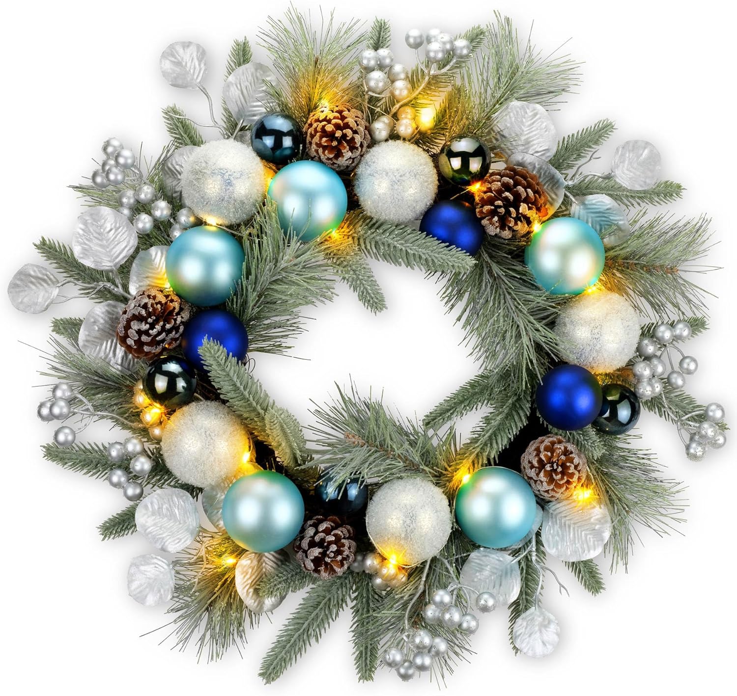 Bring the joy and warmth of the holiday season into your home with the YULETIME Pre-lit Christmas Wreath. Measuring 20 inches in diameter, this festive decoration is the perfect size for hanging on your front door, window, or porch, creating a welcoming atmosphere for your guests.The base frame of the wreath is made of natural rattan, adding a touch of rustic charm. Adorned with red baubles, frosty red berries, natural pine cones, golden leaves, frosted spruce branches and pine needles, and more, this wreath captures the essence of traditional Christmas spirit.The wreath comes pre-lit with 20 warm white LED fairy lights, creating a warm and cozy glow. Setting up the wreath is easy - just unpack, adjust the leaves, insert batteries, and hang it where you'd like (Battery not included).Hang the YULETIME Pre-lit Christmas Wreath on your front door, window, or porch to instantly transform your home into a winter wonderland. Let the warm lights and festive embellishments bring joy and cheer to your holiday season. Order yours today and make this Christmas truly special!